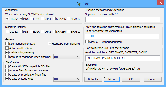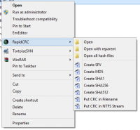 RapidCRC is an open source CRC/MD5/SHA hashing program. I've extended the current unicode support to allow writing of unicode .sfv/.md5/.sha1/.sha256/.sha512 files, which can be turned on/off through the settings page. Unicode sfv files are written as UTF-16LE with BOM or UTF-8 (with or without BOM), and RCRC now performs a codepage detection. I've also expanded the shell extension that was included in the sourcecode to enable all operations directly from the extension.
